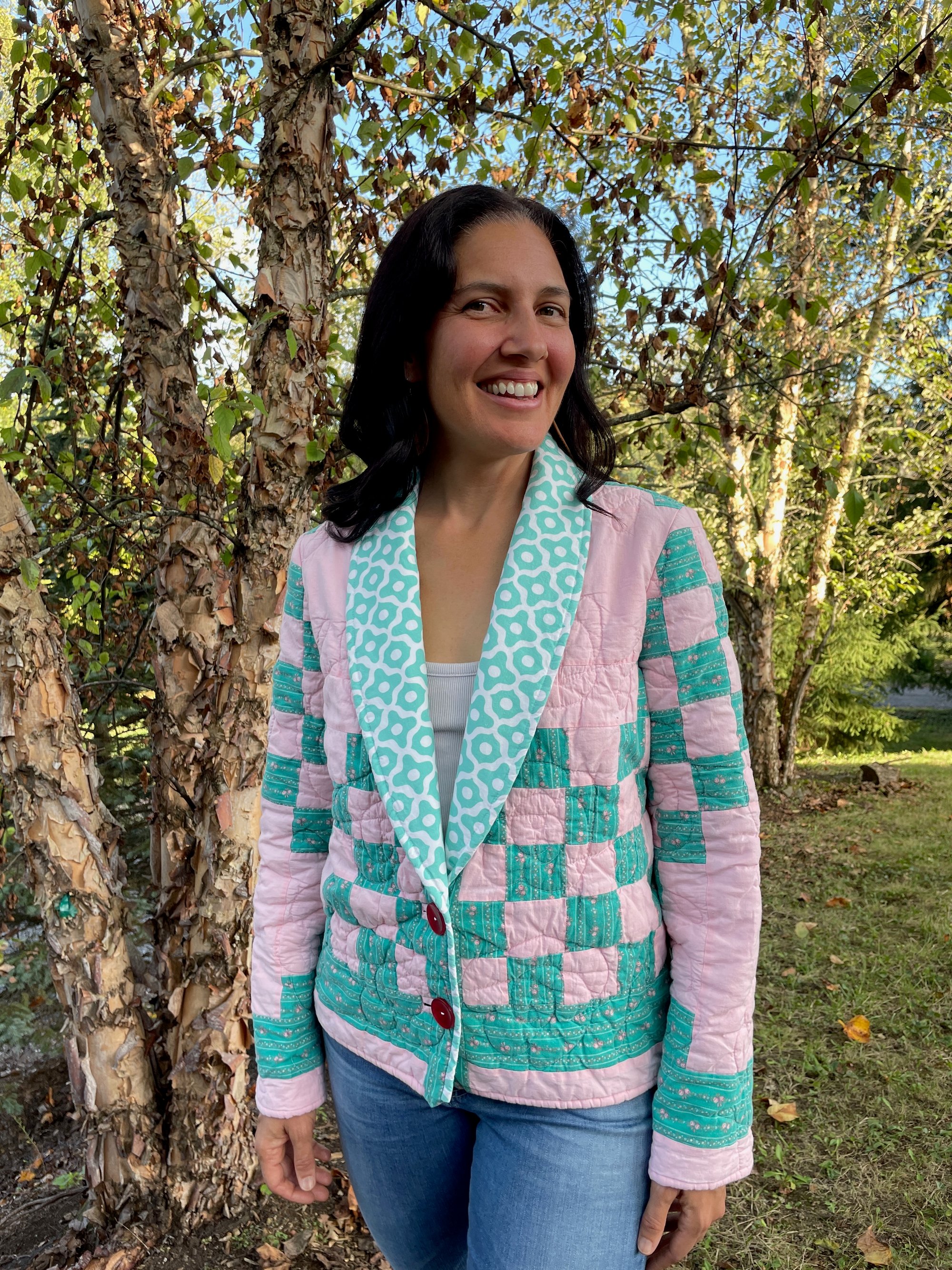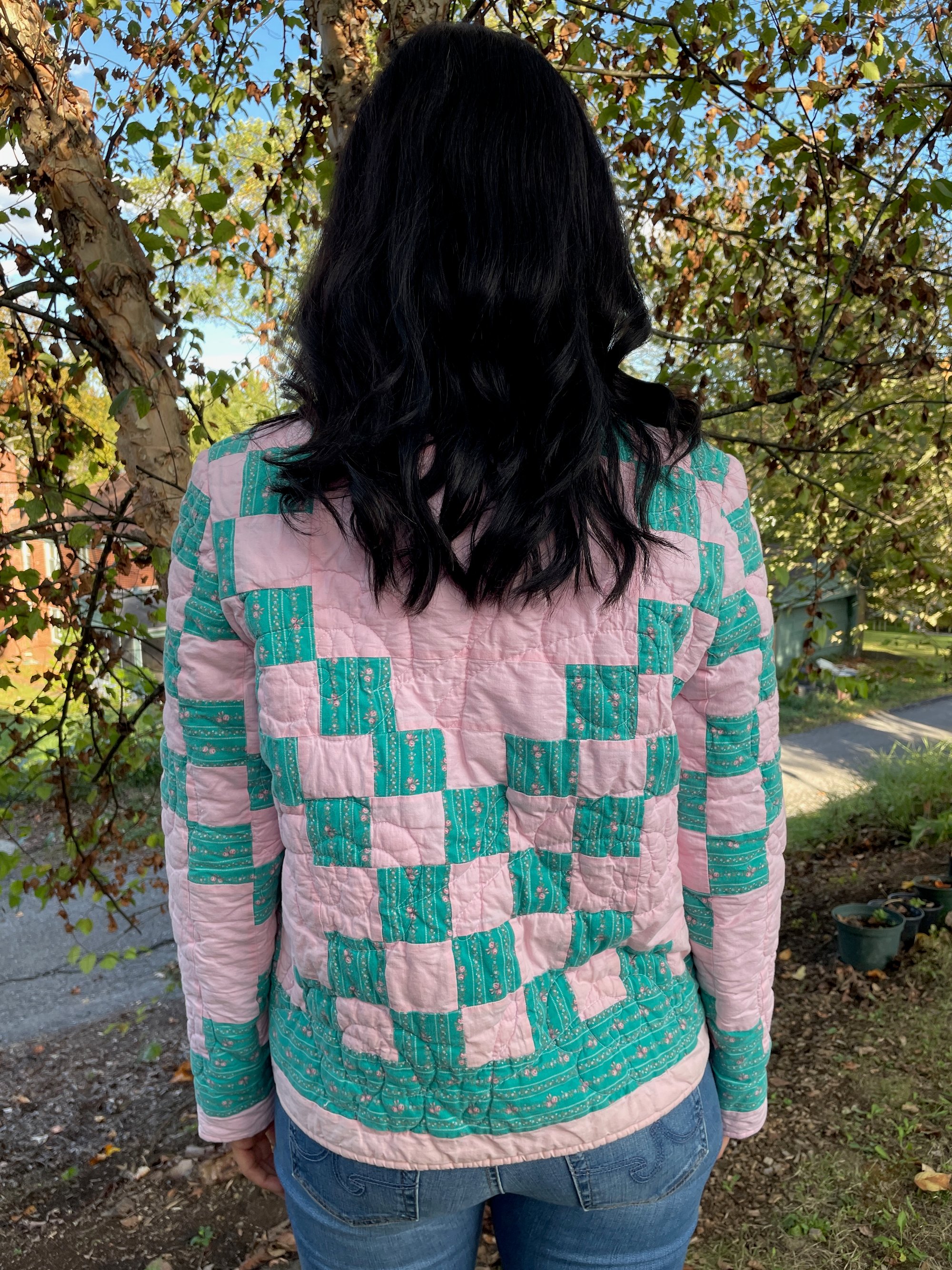 I liked the color combination of this manufactured quilt (machine pieced and machine quilted). The shawl collar and coordinated cuffs are made of a matching cotton print.